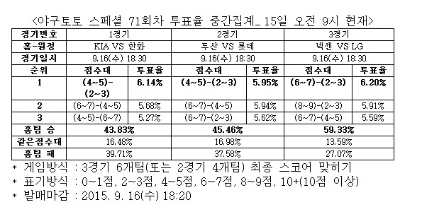 국민체육진흥공단(www.kspo.or.kr)이 발행하는 체육진흥투표권 스포츠토토(www.sportstoto.co.kr)는 16일(수)에 열리는 2015시즌 한국프로야구(KBO) 3경기를 대상으로 한 야구토토 스페셜 71회차 투표율을 중간 집계한 결과, 참가자들은 1경기 KIA-한화전에서 양팀의 치열한 접전을 예상했다고 밝혔다.