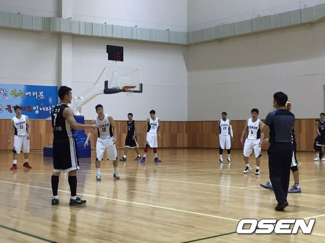 대표팀은 최준용이 소속팀 연세대의 대학리그 경기에 출전해 빠졌다. 강상재는 오른쪽 장딴지 근육파열 부상으로 병원에 검사를 받으러 다녀왔다. 강상재는 전치 1주 진단을 받았다. 대표팀은 10명의 선수로 경기에 임했다. 김태술, 이정현, 문태영, 이승현, 김종규가 주전으로 나왔다. 다음달 세계군인선수권 출전을 앞둔 상무는 좋은 연습상대였다. 상무는 김우람, 변기훈, 차바위, 최진수, 최부경이 먼저 나왔다.