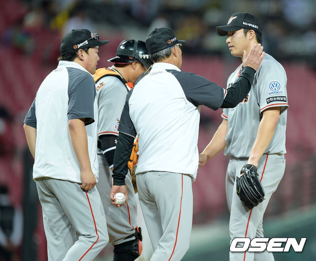 4회말 2사 1,2루에서 한화 김민우가 마운드를 내려가고 있다.