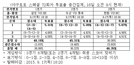 KBO 3경기 대상 야구토토 스페셜 72회차 투표율 중간집계