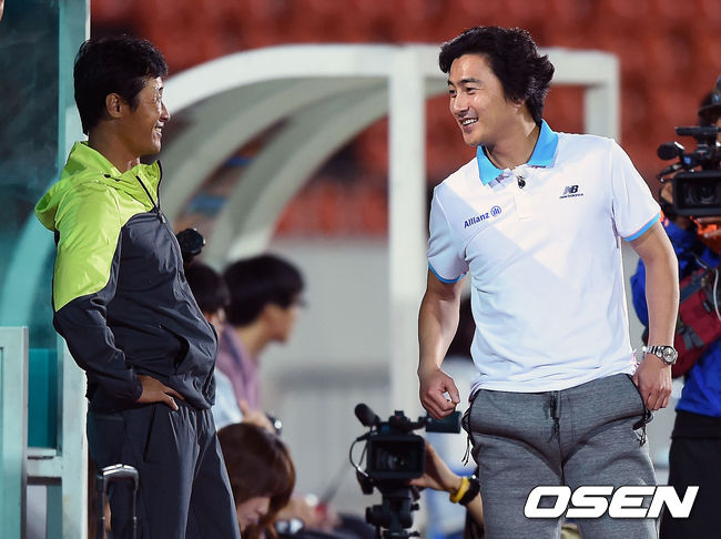 후반, 청춘FC 이을용감독과 안정환 감독이 이야기를 나누며 미소짓고 있다.