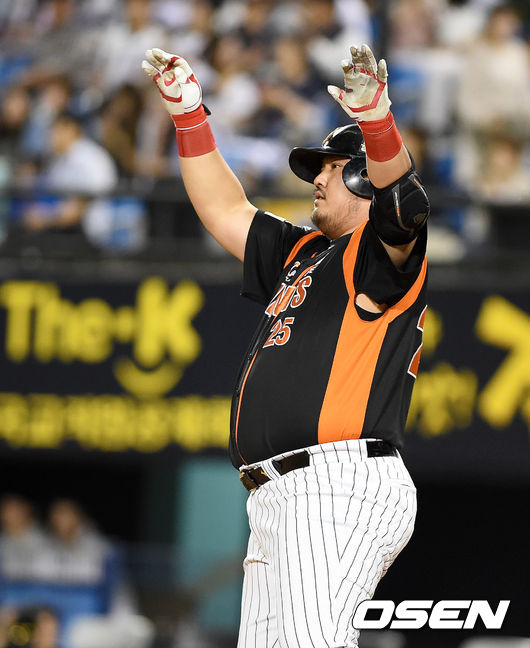 16일 오후 서울 잠실야구장에서 열린 '2015 타이어뱅크 KBO 리그' 두산 베어스와 롯데 자이언츠의 경기, 5회초 무사에서 롯데 최준석이 솔로포를 날리고 타구를 바라보고 있다.