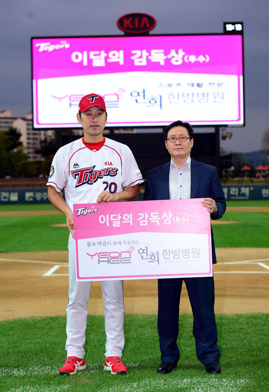 KIA타이거즈 투수 윤석민과 내야수 박찬호가 구단 공식지정병원인 연희한방병원이 시상하는 8월 ‘이달의 감독상’에 선정돼 16일 광주 한화전에 앞서 시상식을 가졌다.