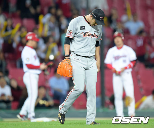 8회말 무사에서 KIA 김주찬에게 우중간 3루타를 허용한 한화 권혁이 아쉬워하고 있다.