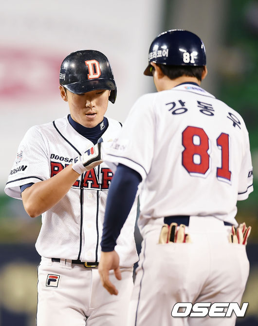 17일 오후 서울 잠실야구장에서 열린 '2015 타이어뱅크 KBO 리그' 두산 베어스와 롯데 자이언츠의 경기, 4회말 1사 주자 2,3루 두산 허경민이 중견수 왼쪽 2타점 적시타를 날린 후 1루에서 강동우 코치와 하이파이브를 하고 있다.