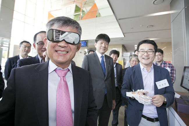 경기센터 육성기업 사업지원 멘토링데이 행사에 참여한 7개 기업 제품을 소개하고 KT CR부문장 전인성 부사장(우측에서 여섯번째)와 임덕래 경기창조경제혁신센터 센터장(좌측에서 여섯번째)이 육성기업 업체 대표 및 직원들과 파이팅을 외치고 있는 모습. 아래는 KT CR부문장 전인성 부사장이 네오펙트의 ‘스마트 LED 글라스’를 시연하고 있는 모습. /KT 제공