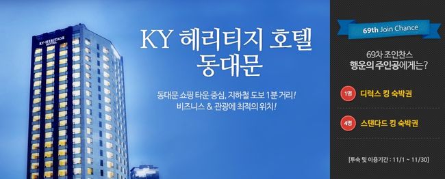 이번 회차에 선정된 KY 헤리지티 호텔 동대문은 2,4,5호선이 만나는 동대문 역사 문화 공원 역 1분 거리에 위치해 편안한 교통시설과 평균 27.1㎡의 여유로운 객실 크기를 자랑한다. 또한 호텔 외부에는 동대문 디자인 플라자, 밀리오레, 두산타워, 청계천, 경복궁 등 다양한 쇼핑 및 관광 시설이 있으며 내부에는 객실 외에 비즈니스 센터와 회의실이 마련되어 있어 쇼핑과 관광, 비즈니스를 할 수 있는 최적의 공간이다.