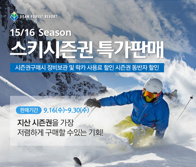 지산 포레스트 리조트(이하 지산리조트)는 오는 30일까지 인터파크·11번가·쿠팡을 통해 15/16 시즌권 특가판매를 진행한다고 밝혔다.