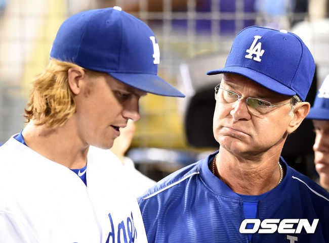 7회초 수비를 마친 잭 그레인키가 매팅리 감독과 이야기를 나누고 있다./ youngrae@osen.co.kr
