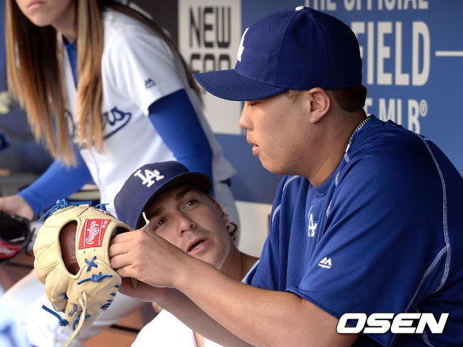 경기에 앞서 다저스 류현진이 키케의 글러브를 살펴보고 있다.