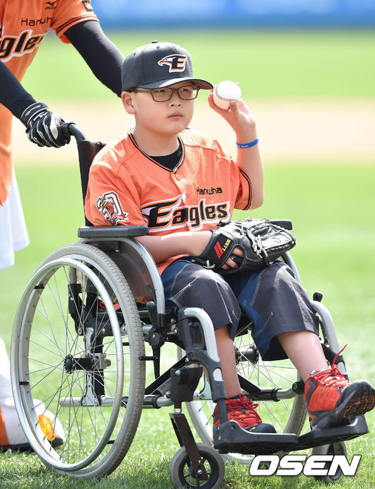 20일 대전 한화생명이글스파크에서 벌어진'2015 타이어뱅크 KBO 리그' 한화 이글스와 두산 베어스의 경기 송명관 군이 시구를 하고 있다.