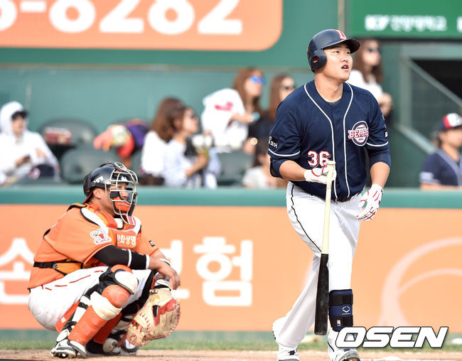 20일 대전 한화생명이글스파크에서 벌어진'2015 타이어뱅크 KBO 리그' 한화 이글스와 두산 베어스의 경기 6회초 오재일이 솔로홈런을 치고 타구를 바라보고 있다.