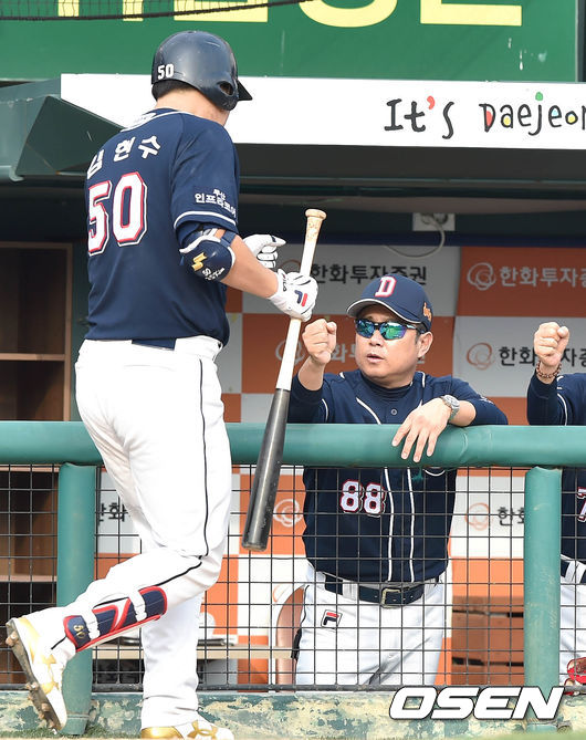 20일 대전 한화생명이글스파크에서 벌어진'2015 타이어뱅크 KBO 리그' 한화 이글스와 두산 베어스의 경기 6회초 김현수가 스리런 홈런을 치고 김태형 감독과 하이파이브를 하고 있다.