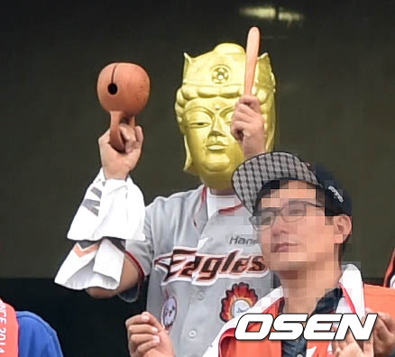 20일 대전 한화생명이글스파크에서 벌어진'2015 타이어뱅크 KBO 리그' 한화 이글스와 두산 베어스의 경기 한화팬이 부처님 가면을 쓰고 응원을 하고 있다.
