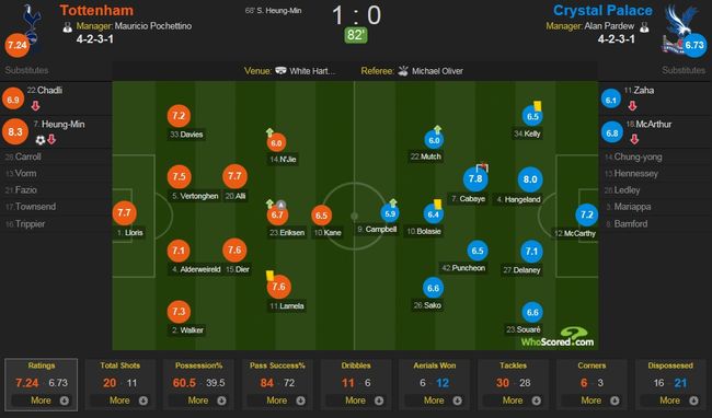 데뷔골을 터트린 손흥민은 영국 통계사이트에서 가장 높은 평가를 받았다. 손흥민에게 후스코어드 닷컴은 8.3점을 부여했다. 이는 토트넘과 크리스탈 팰리스를 모두 합쳐 가장 높은 평점. 손흥민을 필두로 토트넘 선수들은 대부분 7점대의 높은 평가를 받았다.