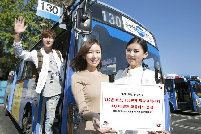 먼저 오는 24일 하루 동안 전국 9개 도시(서울, 부산, 포항, 경주, 거제, 진주, 남원, 목포, 서귀포)에서 각 지역별로 '130번' 버스에 '130번째'까지 탑승한 모든 이용객 대상으로 교통카드 '1만 3000원권'을 선착순 증정한다. 서울을 포함한 전국 곳곳에서 130번 버스로 출근, 등교하는 이용객들에게 큰 호응을 얻을 것으로 기대된다.