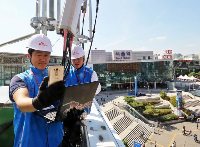 SK텔레콤이 추석 연휴 기간 고객들에게 원활한 통신 서비스를 제공하기 위해 '특별소통대책'을 마련하고 상황실을 운영한다. SK텔레콤 구성원들이 고향으로 떠나는 고객들이 몰릴 서울역에서 기지국 용량 증설 작업을 진행하는 모습.
