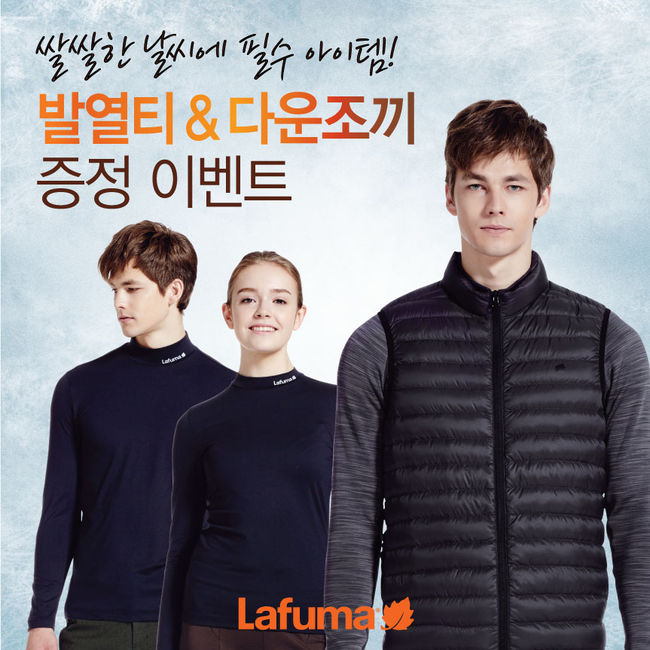 LF(대표 구본걸 www.lfcorp.com)가 전개하는 프랑스 정통 아웃도어 브랜드 라푸마(Lafuma)가 가을 시즌을 맞아 신상품 구매시 발열티셔츠와 다운조끼를 증정하는 사은행사를 실시한다.