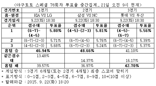 [야구토토] 국민체육진흥공단(www.kspo.or.kr)이 발행하는 체육진흥투표권 스포츠토토(www.sportstoto.co.kr)는 오는 22일에 열리는 2015시즌 한국프로야구(KBO) 3경기를 대상으로 한 야구토토 스페셜 76회차 투표율을 중간 집계한 결과, 참가자들은 2경기 삼성-NC전에서 삼성의 우세를 예상했다고 밝혔다.