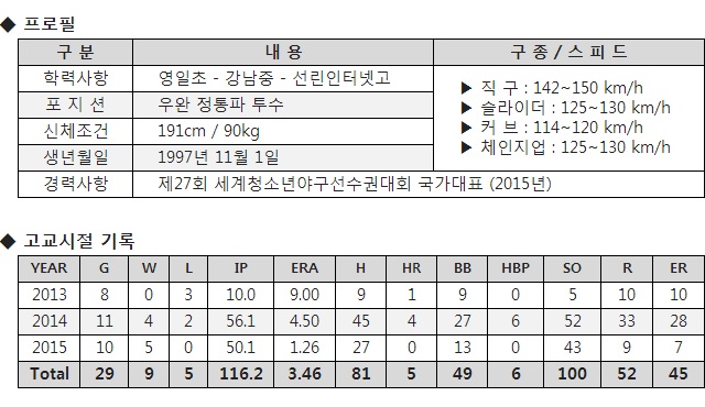 지난 8월 일본 오사카 세계청소년선수권대회 국가대표로 활약한 바 있는 이영하는 전국 랭킹 1위로 평가 받은 초고교급 투수다. 건장한 체격(191cm, 90kg)에서 뿜어져 나오는 최고 150km대의 빠르고 묵직한 공이 강점이며, 제구력 역시 안정적이다. 또한 변화구 구사 능력도 뛰어나 두산의 차세대 에이스로 성장할 것으로 기대하고 있다.