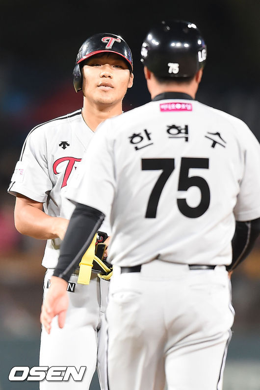 22일 오후 광주 기아 챔피언스 필드에서 열린 '2015 타이어뱅크 KBO 리그' KIA 타이거즈와 LG 트윈스의 경기, 3회초 2사 주자 1,2루 LG 박지규가 좌중간 2타점 적시타를 날린 후 2루에서 한혁수 코치와 하이파이브를 하고 있다.