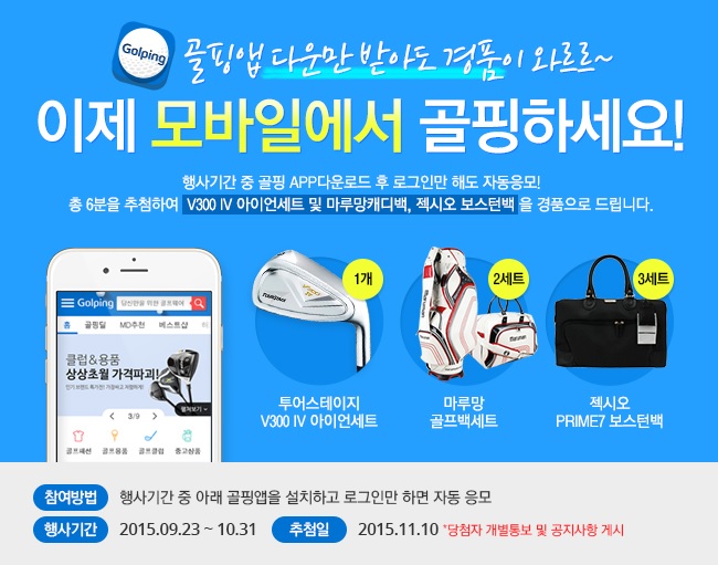 특히 서비스 오픈을 기념해 앱 다운로드 후 로그인한 고객에게는 투어스테이지 V300 Ⅳ 남성용 아이언세트 1개, 마루망 골프백, 보스턴백 2세트, XXIO PRIME7 아이언용 보스턴백 3세트를 증정한다. 이번 이벤트는 골핑 앱에 로그인한 고객은 모두 자동으로 응모되며, 로그인 고객을 대상으로 무작위 추첨을 통해 제공한다.