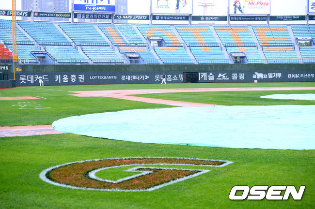 23일 오후 부산 사직구장에서 열린 '2015 타이어뱅크 KBO 리그' 롯데 자이언츠와 두산 베어스의 경기에 앞서 방수포가 덮힌 그라운드.