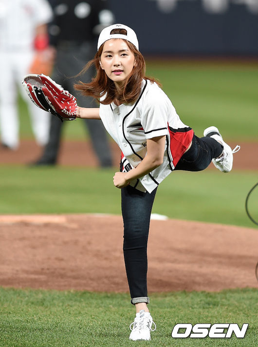경기에 앞서 배우 길은혜가 시구를 하고 있다.