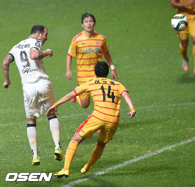 23일 오후 광주월드컵경기장에서 열린 '2015 현대오일뱅크 K리그 클래식' 광주 FC와 전북 현대의 경기, 전반 전북 우루코 베라가 헤딩슛을 날리고 있다.