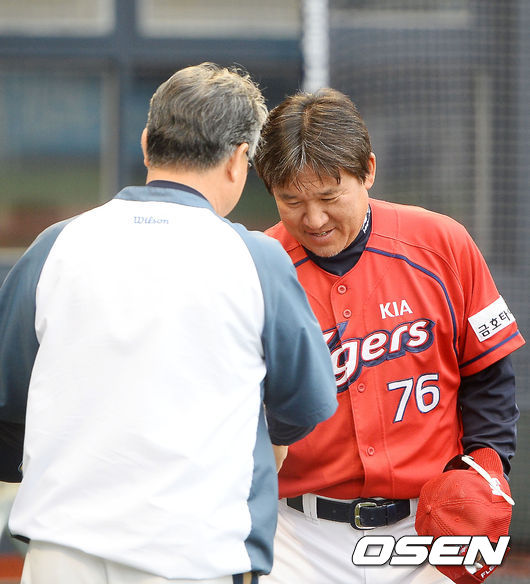 24일 오후 경상남도 창원시 마산야구장에서 '2015 타이어뱅크 KBO 리그' NC 다이노스와 KIA 타이거즈의 경기가 열릴 예정인 가운데 양 팀 훈련시간에 NC 김경문 감독이 KIA 조계현 수석코치와 악수를 나누고 있다.