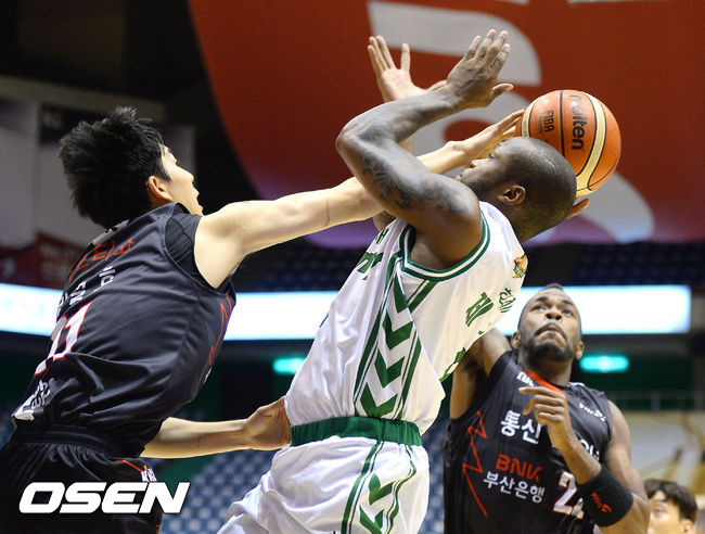 24일 오후 부산 사직체육관에서 열린 '2015-2016 KCC프로농구' 부산 KT와 원주 동부와의 경기, 2쿼터 슛을 시도하는 동부 제임스를 KT 박철호가 수비하고 있다.