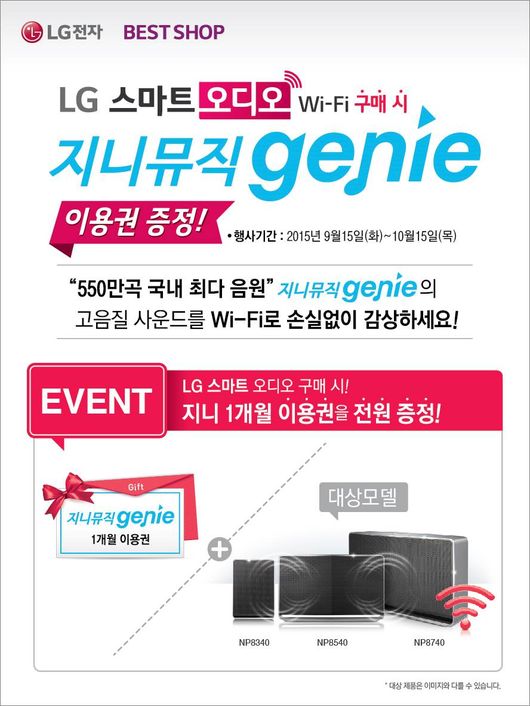 또한 지니는 'LG전자'와 협업해 지니가 국내 최초로 상용화한 'IoT 음악서비스'를 체험할 수 있는 기회도 마련했다. 지니는 전국 LG베스트샵 직영점에서 'LG스마트오디오'를 구매하는 이에게 '지니뮤직 이용권'을 제공, 캐스트 기능을 통해 연결할 수 있는 지니 'IoT 음악서비스'로 고품질 원음 음원을 감상할 수 있다. 이벤트는 10월 15일까지며 대상 제품은 '곡면 사운드바', '와이파이 사운드바', '스마트 오디오 3종(NP8740, NP8540, NP8340)'이다.
