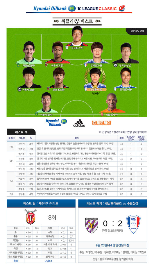 공격수 부문에는 2골을 기록한 까랑가(제주 유나이티드)와 이동국(전북 현대)이 뽑혔다.