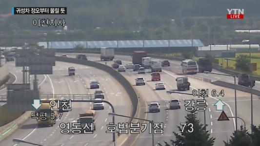 정오부터 시작된 정체는 퇴근 차량이 몰리는 저녁 7시에서 8시까지 절정에 달해서 이후 새벽까지도 계속 답답한 흐름 보일 것으로 전망된다.