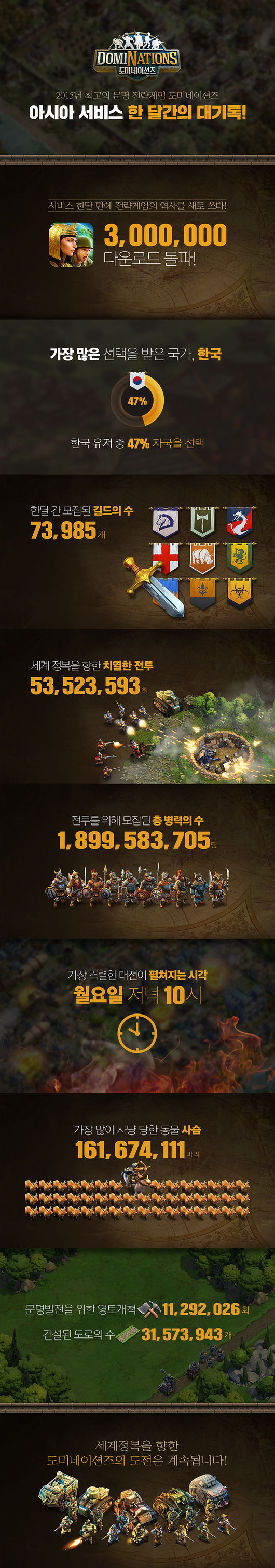 넥슨은 ‘도미네이션즈’의 누적 다운로드 수 300만 건 돌파를 기념해, 아시아 지역 서비스 1개월 기준으로 게임 내 유저들의 유의미한 기록을 담은 ‘인포그래픽’을 공개했다.