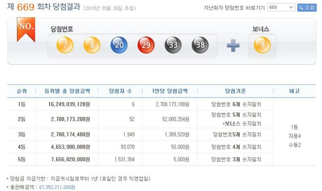 [OSEN=이슈팀] 한가위라 더 특별한 로또 행운의 주인공들이 가려졌다. 제 669차 로또당첨번호가 7, 8, 20, 29, 33, 38번이다.