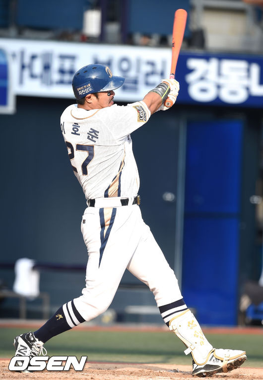 8회말 1사 1루 이호준이 좌익수 앞으로 떨어지는 안타를 때리고 있다.