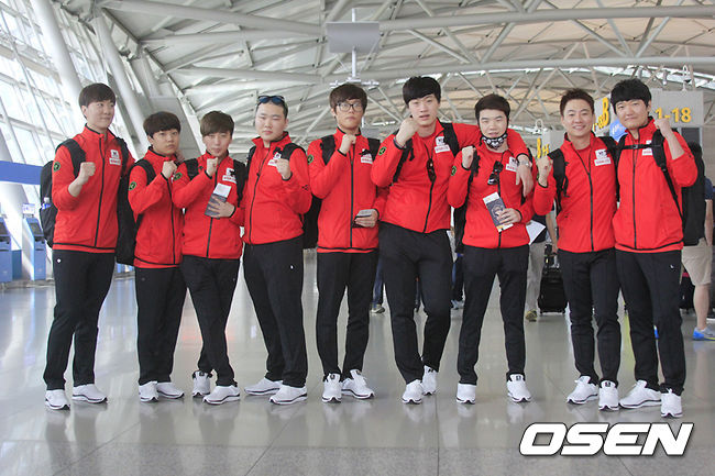 SK텔레콤 T1, KT 롤스터, KOO 타이거즈 등 한국 대표들은 내달 1일 프랑스 르 독 풀먼에서 개막하는 '2015 LOL 월드챔피언십(이하 롤드컵)'에 참가하기 위해 28일 오후 1시 20분 대한항공 K901편으로 출발했다. 출국에 앞서 KT 롤스터가 선전을 다짐하며 기념촬영을 하고 있다.