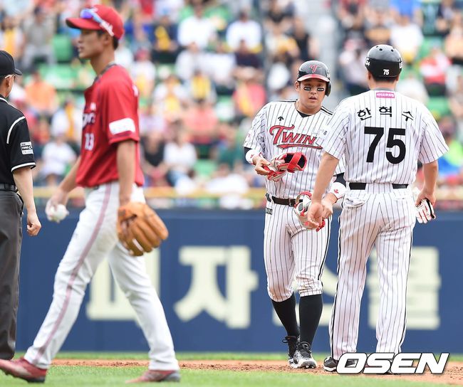 2회말 LG 공격 2사 1, 2루 상황 유강남이 선제 2타점 우익수 방면 2루타를 날리고 2루에 안착해 한혁수 코치와 인사를 나누고 있다.