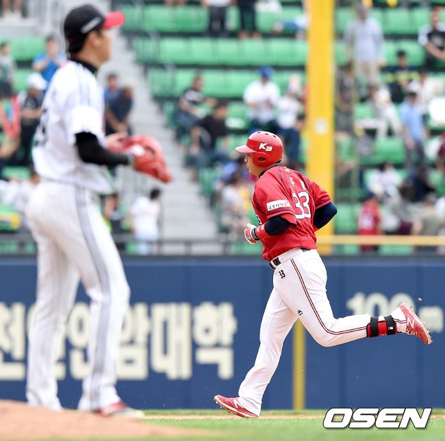 9회초 KIA 공격 1사 주자없는 상황 김주형이 추격의 좌월 솔로포를 날리고 그라운드를 돌고 있다.