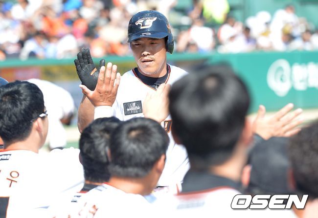 1회말 한화 공격 선두타자로 나선 정근우가 선제 좌월 솔로포를 날리고 홈을 밟은 뒤 동료들과 인사를 나누고 있다.