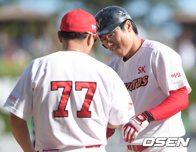5회말 2사 1루에서 SK 박정권이 우전 안타를 치고 미소를 짓고 있다.