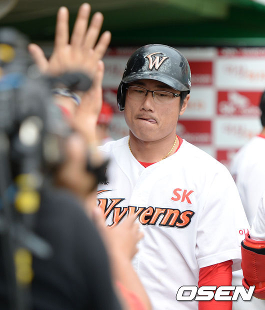 7회말 무사에서 SK 박정권이 중월 솔로 홈런을 치고 더그아웃에서 동료들과 하이파이브를 하고 있다.