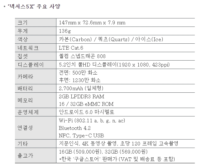 ‘넥서스5X’는 글로벌 시장에 카본(Carbon, 블랙계열), 쿼츠(Quartz, 화이트계열), 아이스(Ice, 하늘색계열) 3가지 색상으로 출시된다. 구매를 원하는 국내 고객은 온라인 웹사이트 ‘구글스토어’에선 3가지 색상을 모두 선택할 수 있고, 오프라인 매장에서는 카본, 쿼츠 2가지 색상을 선택할 수 있다. 국내에서 구매한 고객은 향후 전국 LG전자서비스센터에서 A/S를 받을 수 있다.