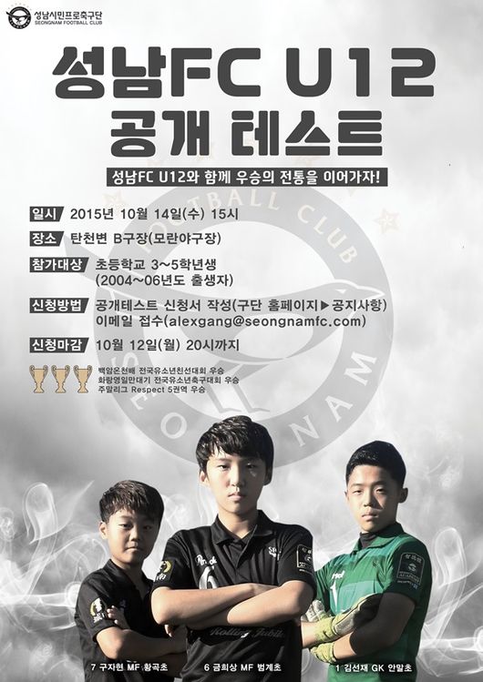 공개테스트 참가를 원하는 학생은 성남FC 공식홈페이지 공지사항에서 신청서를 다운받아 작성한 뒤 이메일로 접수 가능하며 접수 마감은 10월 12일(월) 오후 8시 까지다. 본 공개테스트는 별도의 서류심사 없이 접수대상 모두 참가할 수 있다.
