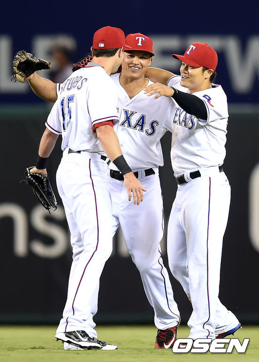 승리를 거둔 텍사스 추신수가 동료들과 기뻐하고 있다./ youngrae@osen.co.kr