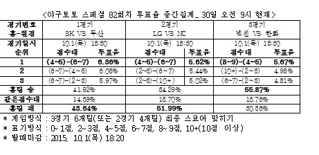 국민체육진흥공단(www.kspo.or.kr)이 발행하는 체육진흥투표권 스포츠토토(www.sportstoto.co.kr)는 10월1일(목)에 열리는 2015시즌 한국프로야구(KBO) 3경기를 대상으로 한 야구토토 스페셜 82회차 투표율을 중간 집계한 결과, 참가자들은 1경기 SK-두산전에서 두산의 우세를 예상했다고 밝혔다.