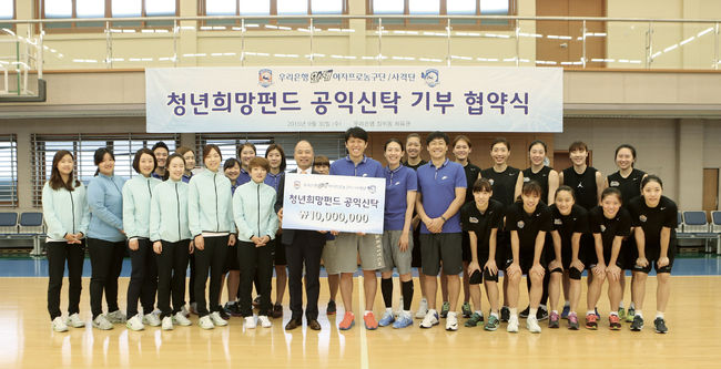 우리은행 한새여자스포츠단(이하 우리은행 스포츠단)은 30일 서울 장위동 우리은행 체육관에서 위성우 농구단 감독 및 권오근 사격단 감독 등 선수단 전원이 참여한 가운데 국내 스포츠단 최초로 청년일자리 창출 지원을 위한 ‘청년희망펀드 공익신탁 기부협약식’을 체결했다고 밝혔다.