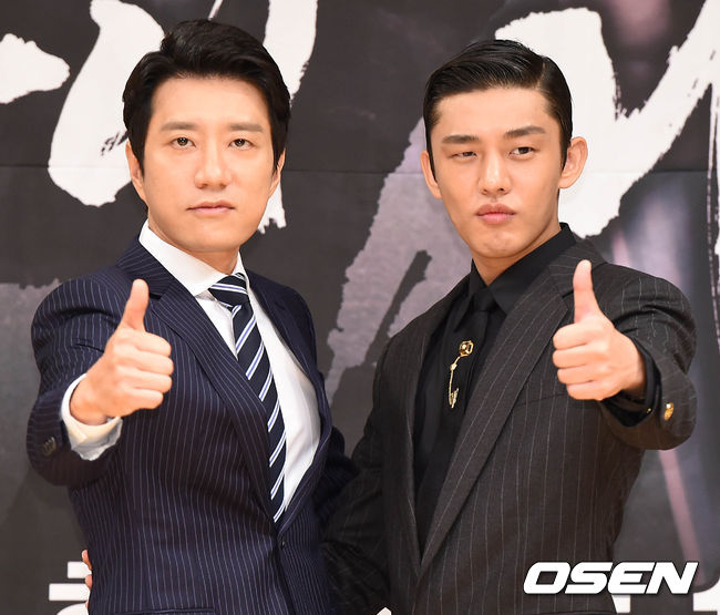 30일 오후 서울 양천구 목동 SBS 13층 홀에서 열린 SBS '육룡이 나르샤' 제작발표회에서 김명민과 유아인이 포토타임을 가지고 있다.