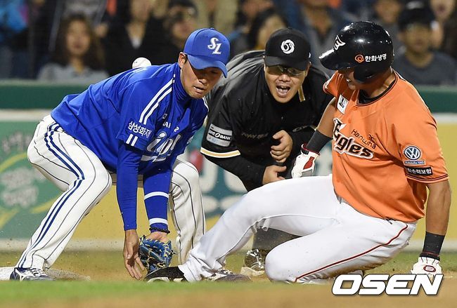 2회말 한화 공격 2사 만루 상황 정근우의 2타점 적시타 때 3루까지 내달린 1루 주자 신성현이 세이프 되고 있다. 송구를 놓치는 삼성 유격수 김상수.